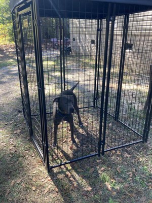 [This review was collected as part of a promotion.] This kennel is made with a rust resistant powder coated finish. I needed a safe space for my pitbull mix. This is large enough to accomodate his size. The frame is very sturdy and the panels are welded perfectly. No chance of him escaping. The bars are spaced well apart allowing ventilation and view from the outside. He has more than enough room to play and stretch out. Assembly was fairly easy. It took two of us about two hours to build it. Overall, this kennel is made well and is a great addition to my backyard. I look forward to owning it for many years.