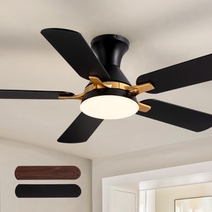 This industrial LED ceiling fan enhances any modern home with its elegant gold and black design. Smart home integration allows easy control of 6 speeds, timers, and customizable lighting through an app or remote, remembering your favorite settings. The whisper-quiet, reversible DC motor provides year-round comfort and energy efficiency. A dimmable 20W LED offers adjustable brightness and three color temperatures for any mood. Its space-saving, 42-inch low-profile design makes it perfect for various rooms and installs easily with included instructions.