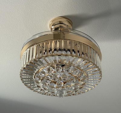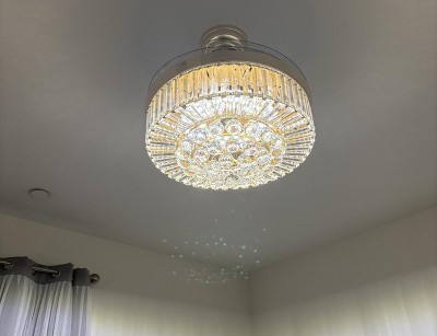 First off, it doesn’t work if you have a light dimmer switch so you would have to switch that out for a regular switch. Secondly, there will be shadow lights reflecting off of the walls due to the sides of the crystals on the chandelier (see pictures). If that bothers you, then it may be best to not get it but overall, it’s a really pretty chandelier and comes with the small LED lights attached. It is bright enough to my liking. The fan retracts back in once not in use. It’s a strong fan even at level 1 setting but wouldn’t recommend maxing it at level 6 since the crystals are dangling off with only a needle securing it. Lastly, you do have to attach each crystal ball which is tedious but well worth it in the end.