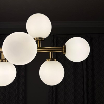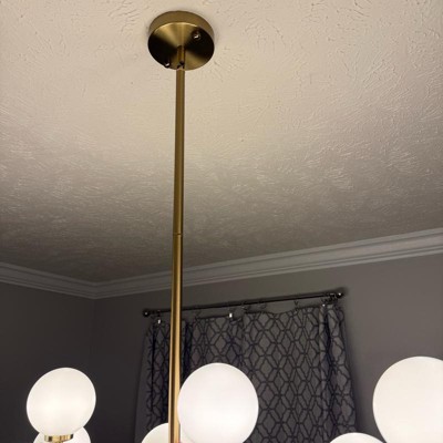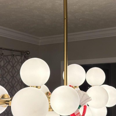 [This review was collected as part of a promotion.] This chandelier is so awesome! I love it. The style is so great with all the circular balls and gold accents. It does not come with light bulbs so we did have to buy some. All the bulbs makes this chandler very bright! Great for doing puzzles under. This also comes with 2 different length options. I am so happy with this product.