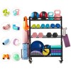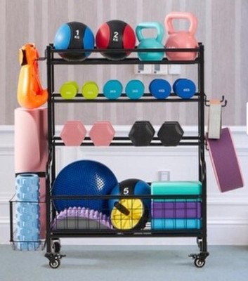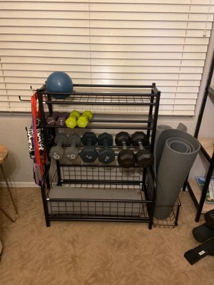 - Extra Large Capacity: Our workout storage rack is equipped with 3 dumbbell storage racks, a side basket perfect for yoga mats and foam rollers, and several side storage hangers for storing resistance bands, roller wheels and more. The bottom storage rack is perfect for storing balls, yoga blocks and other exercise equipment