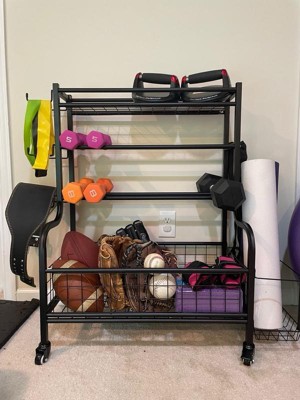 [This review was collected as part of a promotion.] This storage rack and stand was sent to me by Influenster in exchange for my honest review. This is a sturdy piece that would be a good addition to any home gym setup. You could also use this for tools or laundry. The wheels are a nice feature. I would recommend.