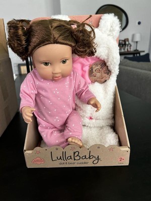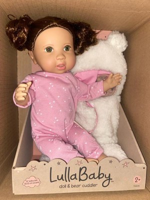- 14” Baby Doll with Hair: An adorable LullaBaby doll with brown hair to style and a soft huggable body and bear cuddler to squeeze and hold.