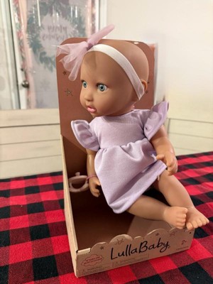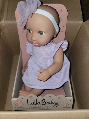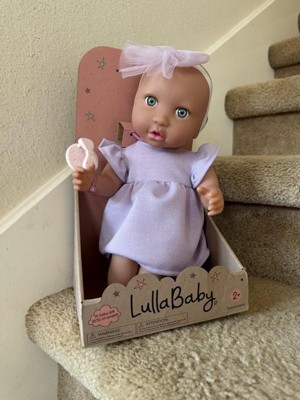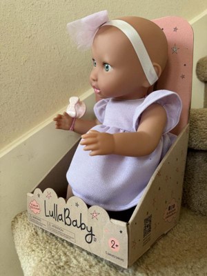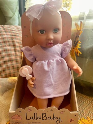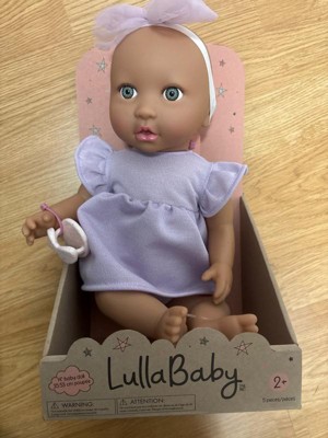 Discover precious playtime moments with LullaBaby. Made with lovable details and realistic features, this 14" baby doll has a friendly facial expression, blue eyes, and a cuddly soft body for little hugs. Plus, kids can explore fashion fun and on-the-go storytelling with baby's adorable outfit, including a ruffle dress and bow headband in sweet shades of purple. The pacifier also lets kids soothe their baby doll during role-play. LullaBaby dolls are a must-have for parents looking to nurture young hearts and minds at an early age, encouraging imagination and inspiring kindness as kids play and grow with their baby dolls. Makes a wonderful gift for kids ages 2 years old and up and a perfect first baby doll for toddlers.