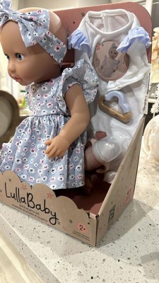 [This review was collected as part of a promotion.] The LullaBaby 14" doll is dressed in an adorable blue floral dress with matching bottoms and a bow headband, as well as a cozy blue-and-white pajama set. It comes with a sippy cup, lid, and teether, all designed to fit into the doll's mouth for realistic role-play. The outfits are designed with easy-open closures, allowing young children to quickly change the doll's clothes.