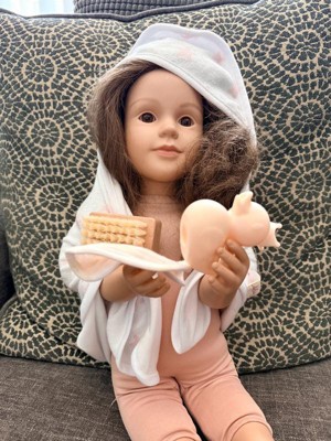 [This review was collected as part of a promotion.] My daughters always try and use our actual baby bath towels for their dolls now they have their own doll sized set! Cute towel and bath accessories for playing with their baby dolls. The brush quality is really nice.
