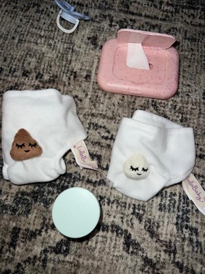 - Includes: Changing table, a baby wipes container, a jar of pretend diaper cream, and 2 whimsical diapers with mini plushies inside for extra giggles.