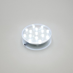 This battery-operated base light provides up-lighting illumination when placed under any transparent or translucent object. This clear plastic base features steady cool white LED bulbs that provide a mesmerizing effect. It's perfect for highlighting a centerpiece, vase, bowl, crystal art, or glass bottles. This LED light is reusable and ideal for wedding receptions, bar areas, and table settings. The sturdy plastic base light requires 3 AA batteries (not included).