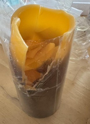 Package arrived heavily damaged (appears to have been shipped from vendor in this condition) and one of the candles was crushed. Returned.