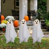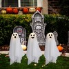 Decorate your outdoor space for Halloween with this set of three battery-operated lighted ghosts. Halloween guests and trick-or-treaters will be delighted to see these three glowing ghosts displayed in your yard. The ghosts are constructed of plastic and covered with a sheer white gauze fabric with black felt eyes and mouths. Warm white fairy lights give the ghosts an eerie glow. To assemble, simply place the ghosts up to 20 inches apart and stake them into the ground. For convenience, the battery pack features a timer option for 6 hours on and 18 hours off. These whimsical ghosts will welcome guests along driveways, walkways, sidewalks or entryways. Lighted ghosts require 3 AA batteries (not included).