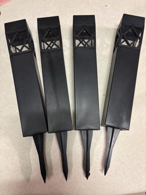 Display this set of four black solar-powered lights along your walkway, garden, or patio. Remove the stakes from the sturdy plastic lights to set on your outdoor table for beautiful illumination. Keep the lights in a sunny area every day to charge the panel for nighttime illumination. The amber LED light shines through the fractal design, creating a beautiful and artistic pattern.