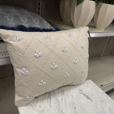 Add coastal charm to your space with this Embellished Shell Cream Lumbar Pillow from Threshold™ designed with Studio McGee. Designed in a rectangular shape, this cream-color decorative pillow features a tonal embroidered diamond pattern and is embellished with white shell clover motifs in the boxes for a standout look. Crafted with a 100% cotton exterior and filled with 100% polyester fiber, it provides ample comfort wherever you place it.