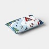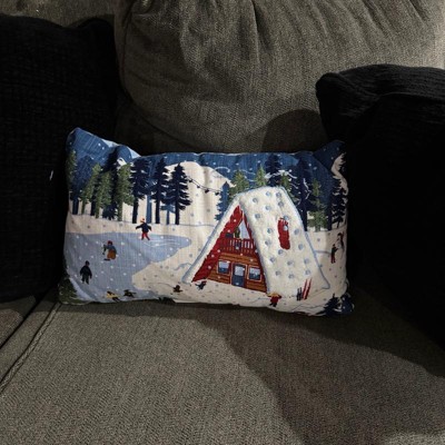 Bring winter wonderland charm to your living space with this Lumbar Snow Scene Throw Pillow from Room Essentials™. This rectangular pillow showcases a playful snow scene with a cabin and ice skaters in white, red, light blue, bright blue and green shades, capturing the magical beauty of a winter landscape. Featuring a cotton exterior and a well-filled interior, the decorative pillow adds the right amount of comfort and style to your sofa, couch, bench or bed.