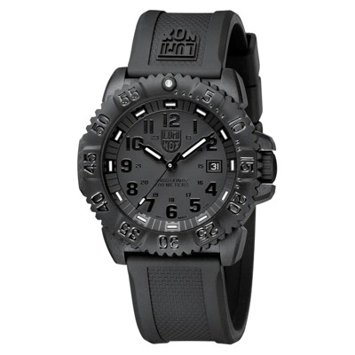 Luminox XS.0324 Leatherback Sea Turtle Giant men's watch features a 44mm wide and 12mm thick black carbonox case with a unidirectional rotating bezel and textured screw-down crown. Luminox XS.0324 is powered by Swiss quartz movement. This stylish watch also features a solid black and blue dial with white accents silver tone luminous hands and Arabic numeral hour markers along with the 12/24-hour time and date display functions, scratch resistant mineral crystal and water resistant to 100 meters. Luminox XS.0324 is equipped with a 22mm wide black silicone rubber strap with a buckle clasp. Luminox XS.0324 men's Leatherback Sea Turtle Giant date watch is brand new and comes in an original gift box and is backed by a 2 years limited warranty.