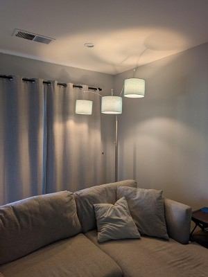 Love love love this lamp. Very sturdy and chic. Great value. It's a little taller than I expected and would probably go better with a higher backed couch instead of my low back couch, but I'm still keeping it because the color of the shades is so unique. Couch back in pics is 32" and ceiling is standard 8'. Doesn't technically dim, just 1, 2 or 3 lights on (see pics).