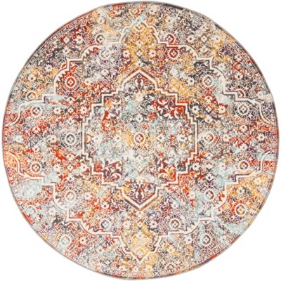 The timeless charm of our rug is encapsulated in its nuanced beige color palette, gracefully enhanced by serene hues of blue and accented with rich tones of rust. Its round shape makes it a versatile addition to any room, fitting seamlessly into a variety of interior settings, from traditional to contemporary.