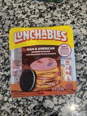 - One 3.2 oz tray of Lunchables Ham & American Cheese Cracker Stackers Snack Kit with Chocolate Creme Sandwich Cookies