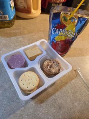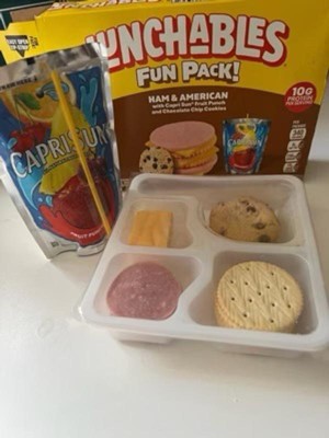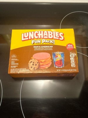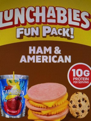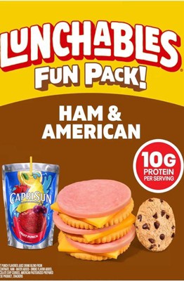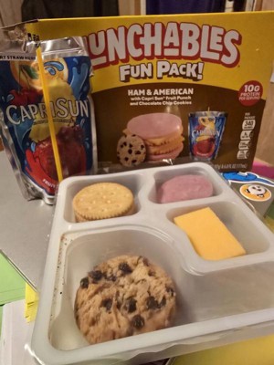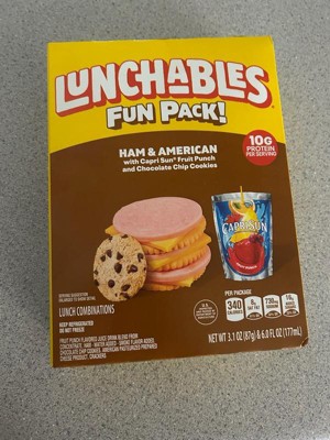 Have fun with lunch! Lunchables Ham & American with Capri Sun Fruit Punch and Chocolate Chip Cookies Fun Pack! lets kids eat it their way — no prep needed! Each 3.1 ounce tray contains ham with water and smoke flavor added and American pasteurized prepared cheese product that are perfectly paired with buttery, flaky crackers featuring the perfect combo of salty and sweet flavor. For a tasty treat, enjoy delicious chocolate chip cookies. Sip on a 6 fl oz pouch of Capri Sun Fruit Punch flavored juice drink blend from concentrate. Packed with protein and fun in every bite, each serving contains 10 grams of protein. Our Lunchables Fun Pack! tastes great and is perfect as part of school lunches, weekend bites or any time hunger strikes. The real win is that kids get to make it and eat it their way! Keep Lunchables refrigerated until you're ready to enjoy.
