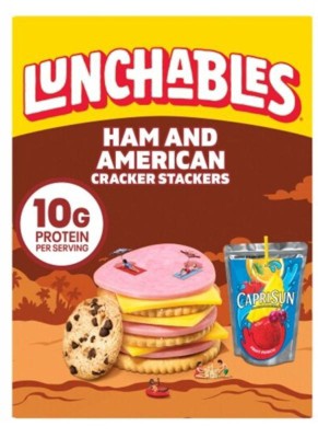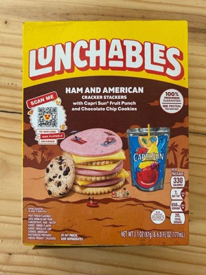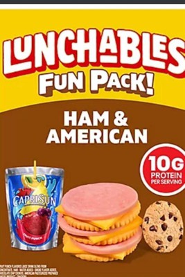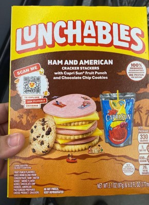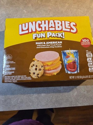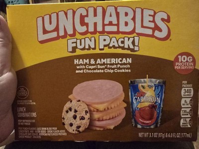 - One 3.1 oz & 6 fl oz package of Lunchables Ham & American with Capri Sun Fruit Punch and Chocolate Chip Cookies Fun Pack