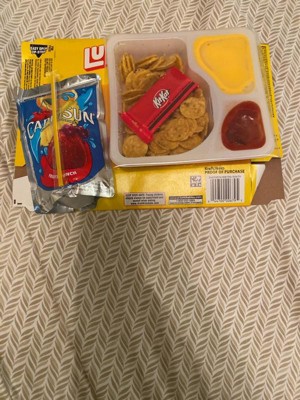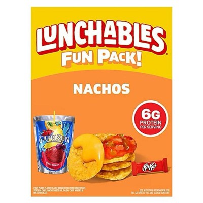 Have fun with lunch! Lunchables Nachos with Capri Sun Fruit Punch & Kit Kat Fun Pack! lets kids eat it their way — no prep needed! Each 4.7-ounce box contains cheesy dip, delicious salsa and crispy tortilla chips. For a tasty treat, enjoy a delicious Kit Kat. Sip on a 6 fl oz pouch of Capri Sun Fruit Punch flavored juice drink blend from concentrate. With fun in every bite, each serving contains 6 grams of protein. Our Lunchables Fun Pack! tastes great and is perfect as part of school lunches, weekend bites or any time hunger strikes. The real win is that kids get to dip it how and when they like, and eat it their way! Keep Lunchables Nachos refrigerated until you're ready to enjoy.