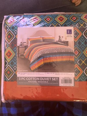 This bright and bold cotton duvet cover set adds a bohemian flair to any bedroom. The Boho Stripe Duvet Sets reversible design lets you easily change up your bedroom look. Replace the fill of the duvet cover for a lighter or heavier weight depending on your preference. This 3-piece set includes 1 duvet cover and 2 pillow shams. The striped duvet cover set is soft for your comfort and 100% cotton. The vibrant colors of this 3-piece duvet cover set are very popular among all age groups from school-age kids to college students and more mature adults. The gender-neutral pattern is a unique trait that lets this set complement almost any bedroom setting. This set is available in both Full/Queen and King sizes with the same soft-to-the-touch fabric. You may notice the sham covers offer slightly different styles. This is because the item is randomly cut, adding to the individuality of the design. The duvet cover and shams are machine washable and safe to tumble dry. This duvet set is OEKO-TEX Standard 100 certified.