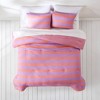 Get into vacation mode with this sunny, resort-inspired striped comforter set. Designed with bold colors in cabana-style stripes, this retro bedding brings the nostalgic feel of summer to your home. The reversible design provides two striped looks in one set, easily complementing a vintage coastal style bedroom. Crafted from soft microfiber with a medium weight polyfill. This 3 piece bedding set includes 1 comforter and 1 sham. STANDARD 100 by OEKO-TEX® certified, all components have been tested and certified free from harmful substances. Machine washable.