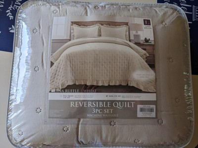 The Reyna Ruffle Reversible Oversized 3 Piece Quilt Set includes a soft and luxurious quilt and two matching pillow shams. The pillow shams also have ruffled edges! It is available in both King and Full/Queen sizes in three neutral options, including white, wheat, and light gray.