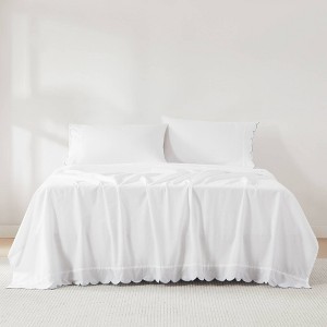 You'll be shore to sleep soundly with these coastal scalloped bed sheets. Reminiscent of rolling waves, this white sheet set has a contrasting scallop trim, adding a pop of color. It's the perfect addition to a coastal or minimalist style home. Crafted from 100% cotton, this 4 piece set includes 1 flat sheet, 1 fitted sheet, and 2 pillowcases. STANDARD 100 by OEKO-TEX® certified, all components have been tested and certified free from harmful substances. Machine washable for easy care.