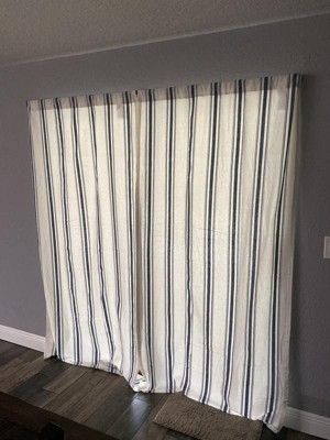 I love these curtains! They are a beautiful, nice medium weight fabric with lovely stripe detail that is reminiscent of the old ticking fabric or grain sacks. Perfect for the farmhouse vibe! I got the navy stripe and it is a perfect dark blue; a true navy. I paired them with a black out fabric liner and some ring clips because I wanted more room darkening, and it works great!