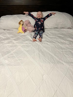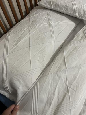 [This review was collected as part of a promotion.] I absolutely love this comforter! We recently moved and I wanted to update our bedding and go for a bit of a different look. This is exactly what I was looking for. It's a nice clean bright white and I like the diamond geo pattern (makes it look not so sterile) there were no loose threads and it washed great and heald up perfectly (have washed it a couple times now and it still looks brand new) it is true to size and I find it to be the perfect thickness, not to thick but also not thin. Honestly it's just perfect!