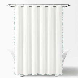 Bring a blend of seaside charm and style to your bathroom with this Coastal Chic Scallop Edge Shower Curtain. The scalloped edge design, reminiscent of the rolling waves along the shoreline, infuses your bathroom with a tranquil coastal ambiance. This coastal shower curtain features a solid white color with a contrasting color binding on the scallop edge. Perfect for coastal, modern, or minimalist decor style bathrooms. With a selection of soothing coastal colors, you can customize your bathroom decor effortlessly. This white shower curtains for bathroom measures 72 inches wide by 72 inches long and will complement your coastal bathroom decor beautifully. Crafted from a linen-textured cotton fabric blend. The 12 button holes at the top of this bathroom shower curtain make it easy to hang with hooks or rings (not included). Because this is a fabric shower curtain, we recommend pairing it with a liner, sold separately. Create a serene, resort-like feel in your bathroom with this chic shower curtain. To care for this bathroom curtain, simply machine wash separately in cold water on the gentle cycle and tumble dry low. Use an iron on low heat to release wrinkles if needed.