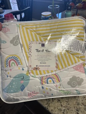 Make bedtime magical with the Lush Decor Magical Narwhal Reversible Quilt Set. Featuring smiling sea unicorns, rainbows, and ocean plants in cheerful pastel shades, this set brings under-the-sea adventure right to your child's room. Enjoy two stylish looks in one set! Simply flip this quilt over to reveal a sunny yellow horizontal stripe pattern. Switch up your kids bedroom decor as often as you'd like with this cute bedding set. This whimsical design fits a coastal decor style. Available in twin and full/queen sizes. This kids bedding set includes 1 reversible quilt and 1 or 2 pillow shams. Crafted from a soft microfiber fabric, this kids quilt set offers softness and comfort. The lightweight polyfill filling is perfect for any season, and even makes this a great layering piece. STANDARD 100 by OEKO-TEX¨ certified, all components have been tested and certified free from harmful substances. To care for this kids bedding set, simply machine wash cold on the gentle cycle and tumble dry low. Use a steamer to remove wrinkles, if needed.