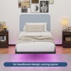 - SMART AMBIENT LIGHTING: Three concealed LED light strips encircle the metal bed frame, offering customizable lighting with over 60,000 RGB colors. Controlled via remote or app, these lights enhance the atmosphere and offer various modes including music synchronization, microphone responsiveness, and timing.
