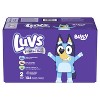Introducing Luvs Platinum Protection diapers featuring Bluey! Luvs disposable diapers have up to 12-hours of Triple Leakguard Protection, but our leak protection doesn't stop there, the secure cuffs and stretchy sides help keep leaks locked in where they happen the most.Feel the softness and bring a new level of comfort for baby's delicate skin. Parenting can be stressful. Rest assured with worry-free Luvs Diapers and give your baby the gentle comfort he/she needs with the name brand protection that parents trust.With Luvs Platinum Protection diapers you know when they go, thanks to a wetness indicator that turns blue on contact with wetness. Plus, meet our best friend, Bluey. These adorably fun patterns give our diapers an added layer of cuteness to match your baby. Here are the highlights:Four levels of protection: Triple Leakguards, wetness indicator, secure and stretchy sides, comfy leak barrier cuffsMax softness: Soft and comfy for your baby's delicate skinIt's not a mystery that babies are pretty delicate, so these diapers are dermatologically tested, hypoallergenic, and free of parabens and latex.*Any fuss? Trust us with our money back guarantee. We think you'll be wondering how you ever got by without these baby diapers, but if you're not loving Luvs for any reason, we'll send you a refund**. Luvs Platinum Protection Baby Diapers are available in sizes N-8. Size newborn (<10 lb), size 1 (8-14lb), size 2 (12-18 lb), size 3 (16-28 lb), size 4 (22-37 lb), size 5 (27+ lb), size 6 (35+ lb), and size 7 (41+ lb), size 8 (46+ lb).*Natural rubber. **If you're not completely satisfied, please send the original receipt and UPC to us within 45 days of purchase for a full product refund via prepaid card. Limited to one redemption per household or name. For additional details, please call 1-888-665-3257.