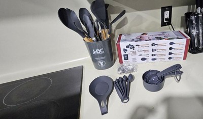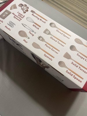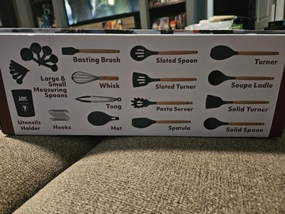 - What's in the Box: 1x Solid Tuner, 1x Solid Spoon, 1x Slotted Turner, 1x Slotted Spoon, 1x Pasta Server, 1x Turner, 1x Ladle, 1x Spatula, 1x Egg whisk, 1x Basting Brush, 1x Tong, 1x Mat, 1x Utensil Holder, 12x S-shaped Hooks, 5x Small Measuring Spoons & 5x Measuring Cups