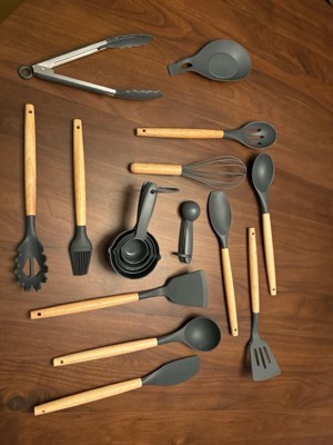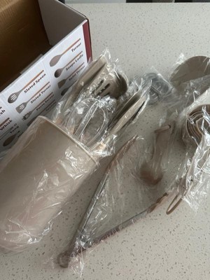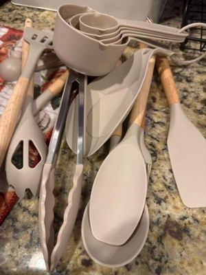 [This review was collected as part of a promotion.] Very nice kitchen set. It has everything you need. The khaki color is very pretty. I like that all the utensils are silicone so it doesn’t scratch up your pots and pans.