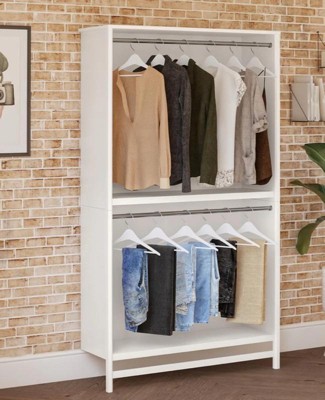 - LUXURIOUS AND PRACTICAL: The Luxe 2 Shelf Double Clothing Rod Closet Tower from Systembuild Evolution provides two built-in clothing rods and two wide shelves for bins or shoe boxes