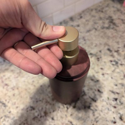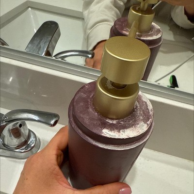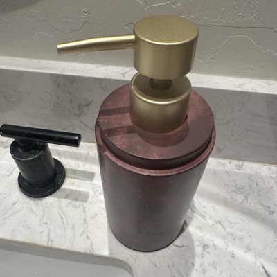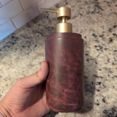 [This review was collected as part of a promotion.] This seems like a sturdy soap container. The coloring is a maroon or reddish brown. The container seems fairly high quality. The top pump is gold, but it feels like plastic. I don't like the poor quality of the pump as I think my children will break this easily. I don't think this will last long in our bathroom. The pump works smoothly for now. It's good if it matches your aesthetic I received an incentive to write this review.