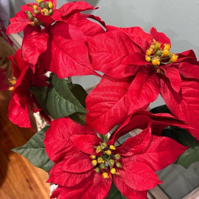 Accent your interiors in vibrant style with this Luxe Poinsettia Artificial Stem from Threshold™. This artificial stem features beautiful faux poinsettia flowers with green leaves arranged together for a nature-inspired look that blends well with a variety of decor styles. This 16-inch stem makes a lovely addition to a jar, tall vase or a bold arrangement, and it requires no watering to stay fresh year-round.