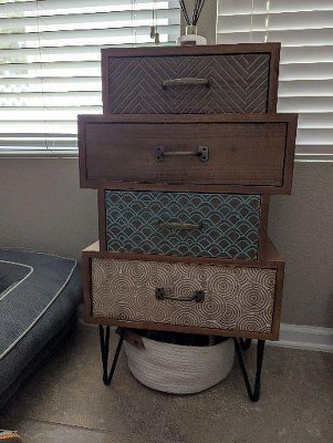 The rustic multi-drawer nightstand is an eye-catching piece that captures the essence of the apothecary-style chest. The one-piece wood body looks like different sized drawers stacked on top of each other. The face of each drawer has unique and visually appealing designs that add to the charm of the table, and make it versatile that coordinates and complements most interior designs. The chest flirts with the mid-century modern impression by its metal v-legs giving the side table a lift. The side table is a handy and striking addition to any room of the house, and is the ideal piece to hold things you need to keep close at hand. This accent chest also makes a great gift for weddings, housewarmings, holidays, and birthdays. Add rustic charm to your life and enjoy the stylish chest in your home.