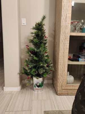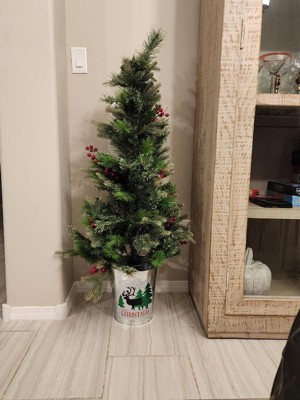 Small in size, big on charm! This 4-foot pre-lit Christmas tree is the perfect festive touch for apartments, entryways, classrooms, or office corners. Set in a shiny metal pot with playful holiday stickers, it’s ready to spread cheer right out of the box. The mix of branch styles adds rich texture, while clusters of bright red berries give it a warm, classic holiday feel. Built-in lights make decorating easy — just add batteries and enjoy the glow!.