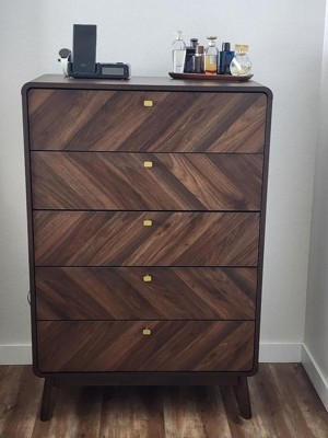 [This review was collected as part of a promotion.] LuxenHome's Theo 5-drawer chest blends modern style with timeless walnut wood. It's contemporary, but still complements the classic style of my family’s furniture set at home! Plus, the spacious drawers offer great storage. Huge win for those needing extra clothing storage!