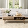 Introducing a coffee table that is more than just a functional piece of furniture. This sleek and elegant design is crafted to infuse your space with style and sophistication. The slatted sliding doors offer a glimpse into the dual-side storage, providing an uncluttered space to store your essentials. Ideal for contemporary apartments and intimate family homes, this coffee table is the perfect centerpiece for your gathering area. With ample surface space, sturdy foundation, and a design that is sure to impress, it is perfect for showcasing your favorite books, decorative items, or even your morning cup of coffee. Get ready to elevate your space with this must-have coffee table.