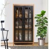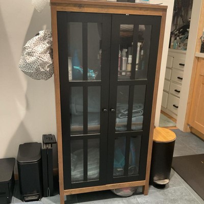LuxenHome Storage Cabinet with 2-Door Natural Wood Glass 47.2" Curio Accent Cabinet for Living Room, Farmhouse Kitchen Pantry Brown, Black