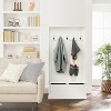 The functional and stylish hall tree with a storage bench and coat rack is the perfect focal point for your entryway. The hall tree and bench is visually appealing with its white finish to brighten up your space, while providing the necessary to storage to keep your entrance clutter-free. With five metal hooks and a roomy storage bench for sitting, it is the perfect addition for any entryway, hallway, mudroom, or laundry room. The bead board paneling give the hall tree a traditional style that works with multiple interior designs. Pull up the bench lid to reveal the ample spacious storage space inside, perfect for storing shoes, bags, and other clutter best kept out of sight. The tall, slatted back is equipped with hooks for hanging coats out of the way.