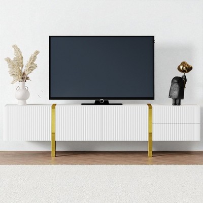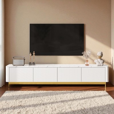 Elegant Curved Design – This modern TV stand boasts a unique curved silhouette, smooth fluted drawer fronts, and a gold-finished base, creating a high-end aesthetic perfect for luxury living rooms or upscale entertainment spaces.