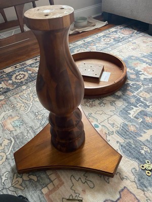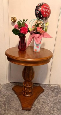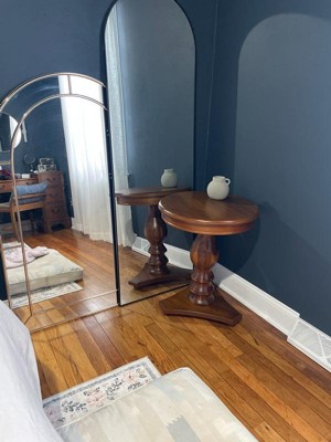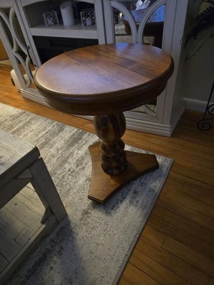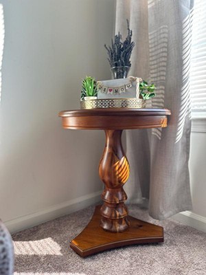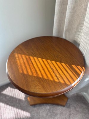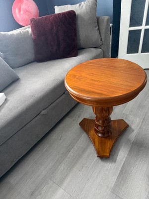 [This review was collected as part of a promotion.] Beautiful, classic wood accent table! The turned wood pedestal and rich finish give it a timeless, elegant look, and the triangular base makes it feel sturdy, and go into a tight space. It’s the perfect size for an accent table—great next to a chair or even as a bedside table! The wood looks high quality and it blends easily with different décor vibes. Simple, stylish, and functional.