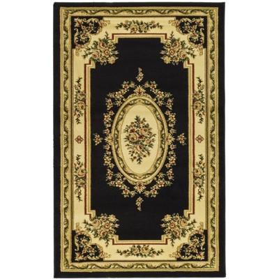The rich black and ivory color palette creates a bold contrast, highlighting the intricate patterns that adorn this exquisite piece. Traditional motifs dance across the rug, featuring floral designs and ornate borders that speak to its timeless allure. Each detail is power-loomed to perfection, ensuring crisp visuals that captivate and command attention.