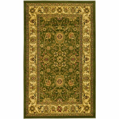 The rug's rich sage green background is ornamented with an elegant ivory pattern, featuring traditional floral and scroll motifs that exude a sense of luxury and sophistication. The detailed border encapsulates the central pattern, creating a well-balanced and harmonious aesthetic.