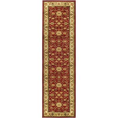 The rich red base of the runner is adorned with a sophisticated floral and vine pattern, surrounded by an elaborate border that frames the design perfectly. The ivory accents and hints of complementary tones create a harmonious look that will enrich and complete the look of your hallway or long and narrow spaces.